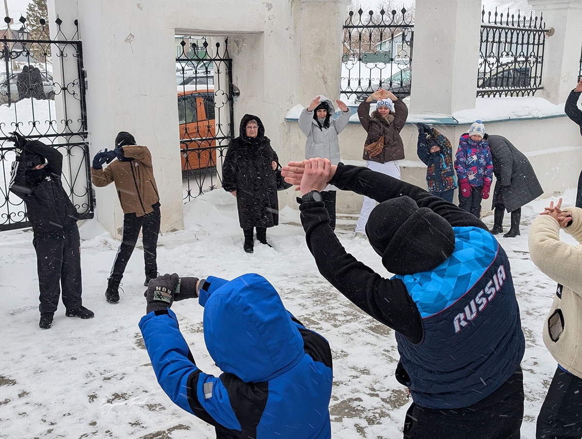 Разыгравшаяся метель не позволила осуществить легкоатлетическую пробежку, которая была по плану после молебна, но не остановила от спортивной разминки.